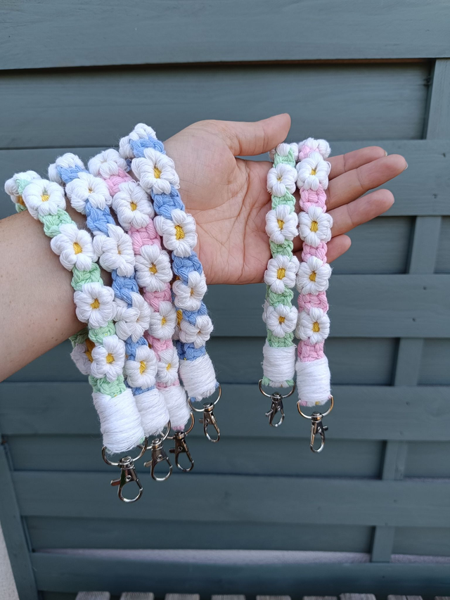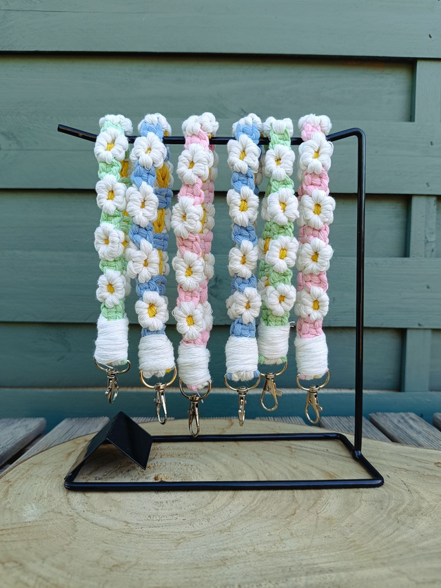 Apportez une touche colorée et poétique à vos clés, sacs ou pochettes grâce à cette dragonne en macramé entièrement faite à la main. Chaque dragonne est composée de jolies fleurs tressées qui apportent une note fraîche et printanière à vos accessoires.